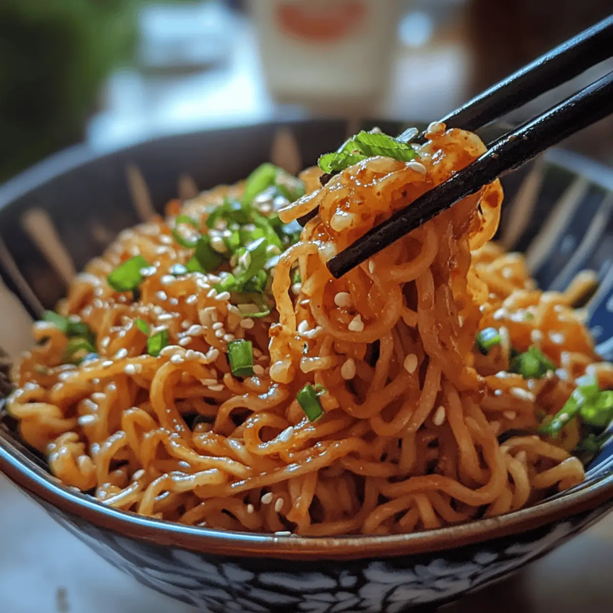 Add toppings: Sprinkle shredded carrots and chopped green onions over the noodles, tossing lightly to distribute bright orange crunch and fresh, zesty pops of color.
